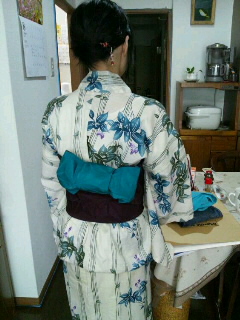 うちでシマコに着付けをお教えする仕事をした後。