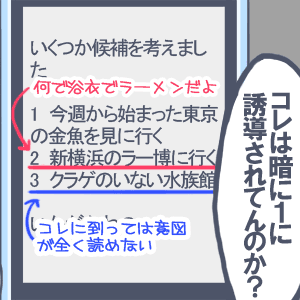 提案した場所をことごとく「行った事ある」という理由で却下されたからです。