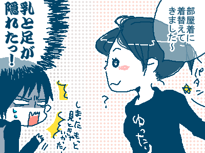 ・着くなり、オシャレ着を部屋着に着替えるかちょさん。
